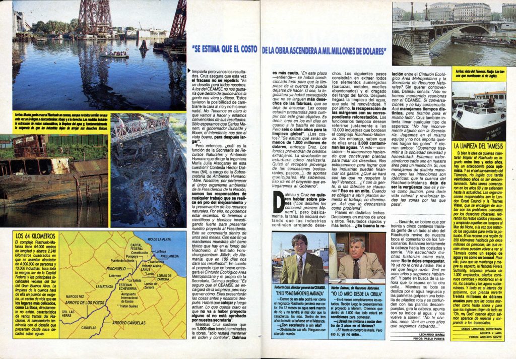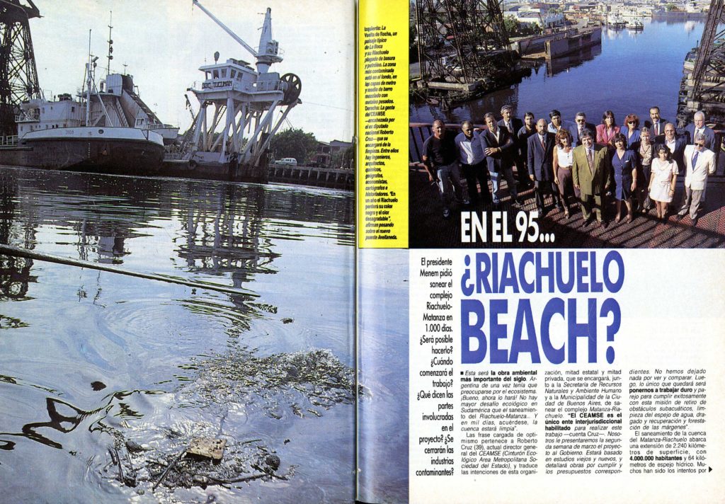 El Riachuelo y la promesa de su limpieza fue uno de los temas que recorrieron la década del '90 y los años que siguieron. Durante su primera presidencia, Carlos Menem prometió sanear en 1.000 días la Cuenca Matanza-Riachuelo, altamente contaminada. La recuperación del río parecía una causa perdida. En 1997 el BID aprobó un préstamo para la misión, pero nunca llegaron a ejecutarse los fondos. El problema persiste: en 2006 se creó ACUMAR (Autoridad de Cuenca Matanza-Riachuelo) para articular políticas públicas orientadas a sanear el territorio y mejorar la calidad de vida de las familias instaladas en la cuenca.