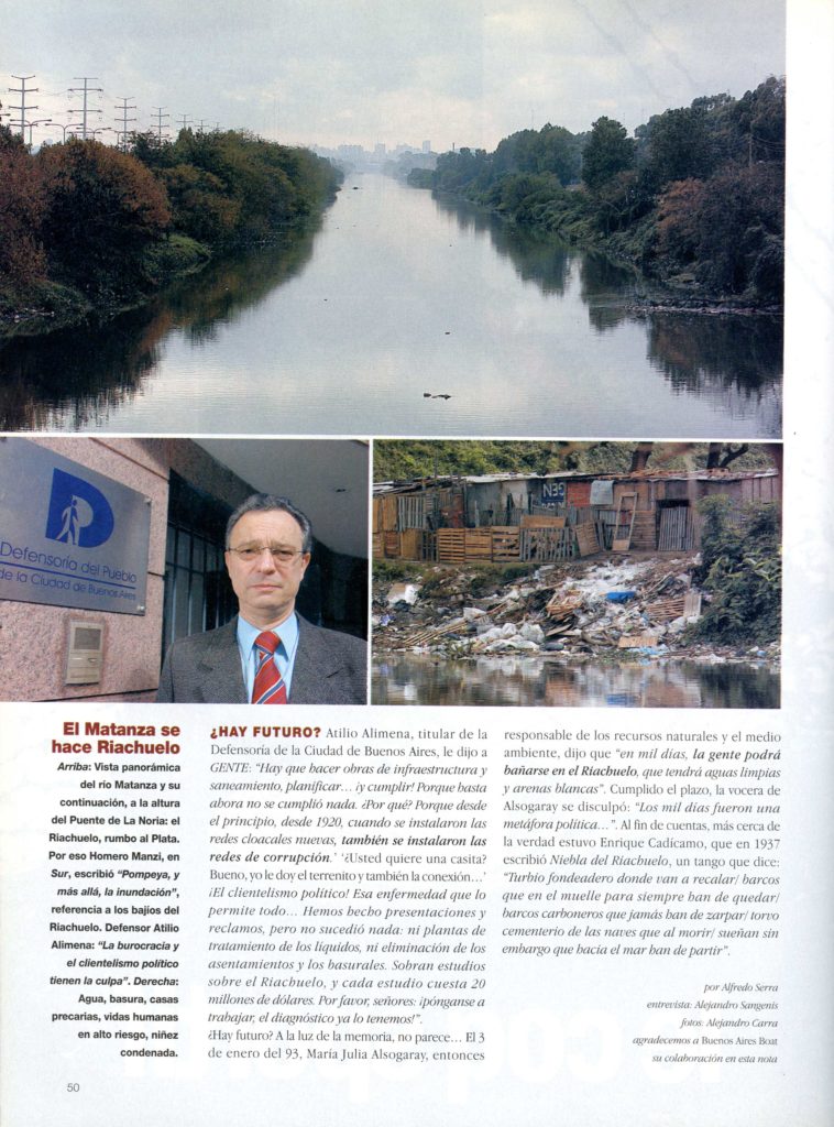 "Algo huele a podrido en Buenos Aires", continuaba alertando GENTE en 2006. El agua de la cuenca se convertía en uno de los puntos más contaminados del planeta. "En algunos tramos tiene siete capas de venenos químicos y metálicos que causan decenas de enfermedades", alertaba la nota, en la que los especialistas planteaban su punto de vista respecto al agua.