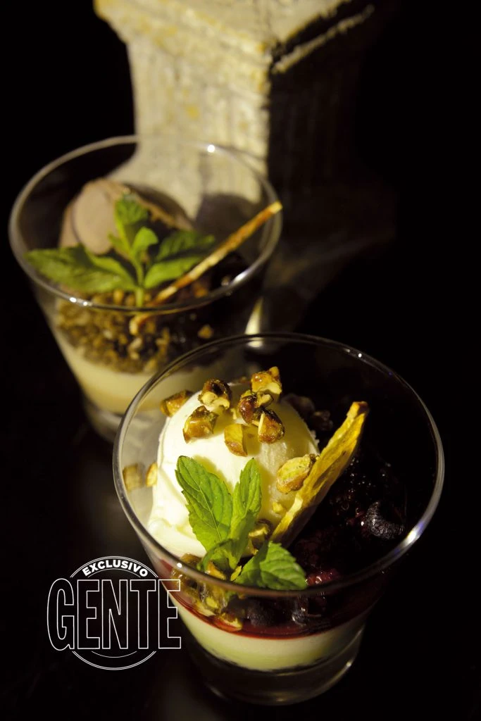 ¿Los postres? De pistachos con mousse de chocolate blanco, frutos rojos y crema helada, y de chocolate con cremoso de dulce de leche y vainilla, amarenas y crema helada de chocolate.