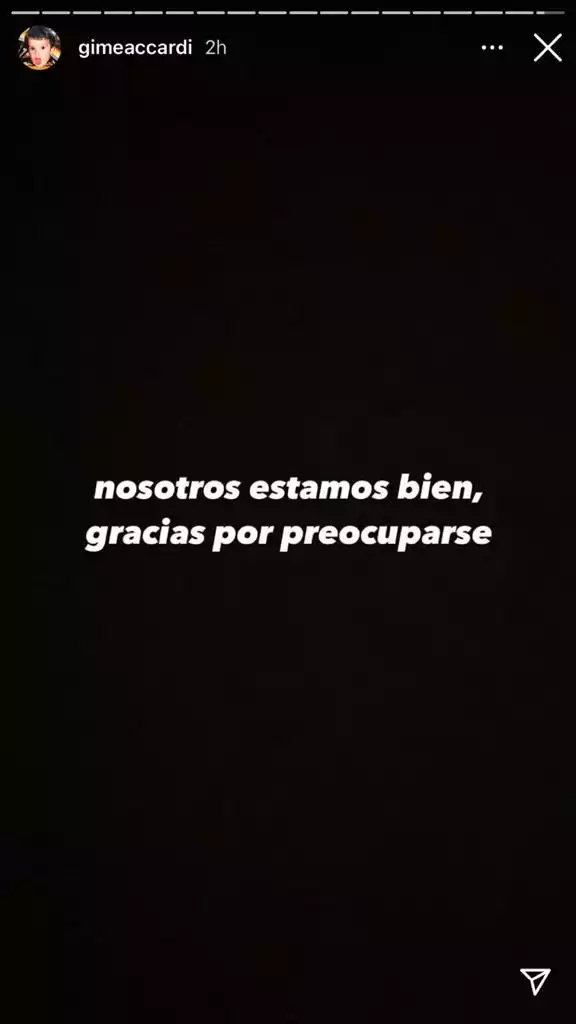 A través de sus historias de Instagram, la actriz escribió en letras blancas y un fondo negro la frase: “Nosotros estamos bien. Gracias por preocuparse”. Por su parte, Nico manifestó: “Gracias a Dios nosotros estamos bien. Gracias por la preocupación”.