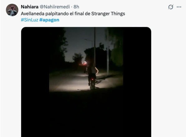 En Twitter no faltaron quienes trazaron paralelismos con el estreno del último capítulo de Stranger Things. “La mejor publicidad para el último capítulo de Stranger Things es un apagón de Edesur en medio de una ola de calor”, posteó Victoria Ferrero en su cuenta de X. Otra usuaria (@nahiiremedi) compartió una postal a oscuras en Avellaneda andando en bicicleta para "palpitar" el estreno terrorífico.