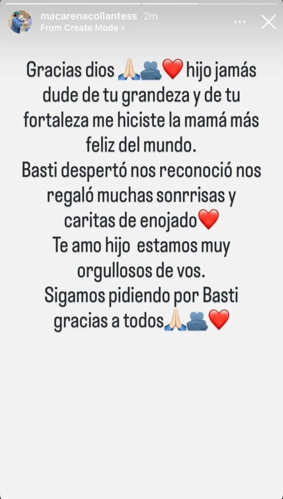 “Gracias dios. Hijo jamás dude de tu grandeza y de tu fortaleza. Me hiciste la mamá más feliz del mundo. Basti despertó nos reconoció nos regaló muchas sonrisas y caritas de enojado. Te amo hijo estamos muy orgullosos de vos. Sigamos pidiendo por Basti, gracias a todos”, escribió la mujer, quien desde el primer momento compartió el día a día de la internación y agradeció el acompañamiento recibido.