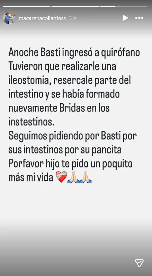 “Anoche Basti ingresó a quirófano… tuvieron que realizarle una ileostomía, sacarle parte del intestino, y se habían formado nuevamente bridas en los intestinos”, escribió la mujer en sus historias de Instagram, donde sigue compartiendo el minuto a minuto de la recuperación de su hijo.