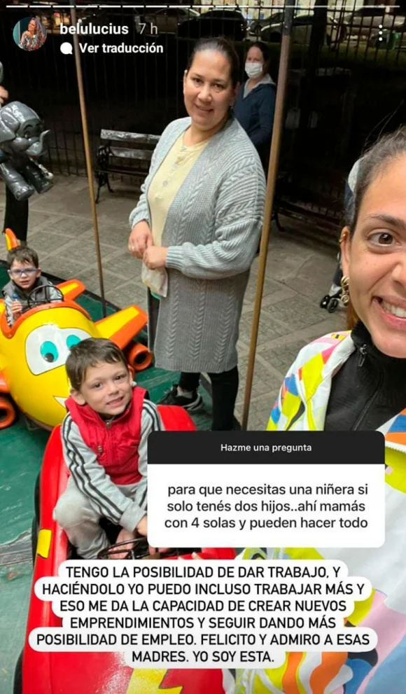 Entonces, Belu le respondió con firmeza: “Tengo la posibilidad de dar trabajo y haciéndolo yo puedo incluso trabajar más y eso me da la capacidad de crear nuevos emprendimientos y seguir dando más posibilidad de empleo”. Además, añadió: “Felicito y admiro a esas madres. Yo soy esta”, cerró contundente junto a una foto de su hijo y Elsa, la ya famosa niñera.