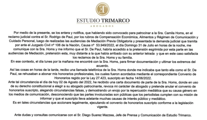 Ignacio Trimarco apuntó contra Camila Homs por no querer pagarle los honorarios. Según detalla el escrito, el abogado habría recibido un llamado de Homs el lunes por la tarde en el que le informaban que tanto ella, como De Paul, se "rehusaban" a abonar los honorarios acordados.