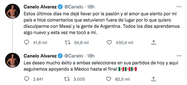 Y agregó: ”Todos los días aprendemos algo nuevo y esta vez me tocó a mí”, publicó Canelo una hora antes de que la selección azteca se enfrenara a Arabia Saudita y la Albiceleste hiciera lo propio ante Polonia en la definición de la zona.