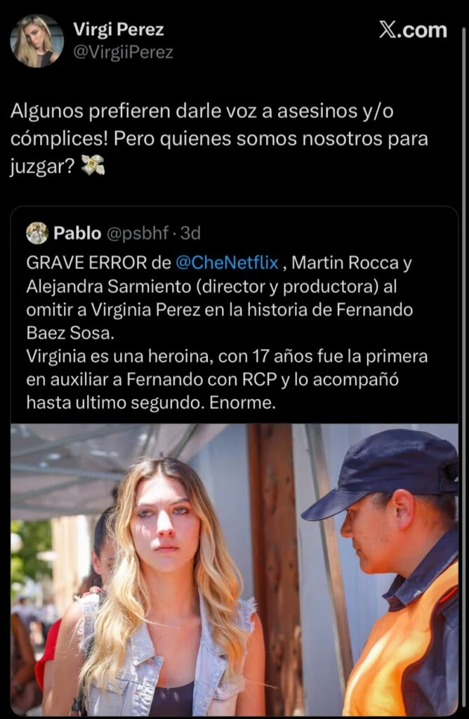 El pasado 13 de noviembre, tras el estreno de la docuserie, las redes sociales se hicieron eco de su ausencia. Entre los mensajes que reclamaban por qué no había sido incluida, Virginia decidió responder con firmeza desde su cuenta de X (ex Twitter). “Algunos prefieren darles voz a asesinos y/o cómplices! ¿Pero quienes somos nosotros para juzgar?”, escribió, dejando en claro su malestar.