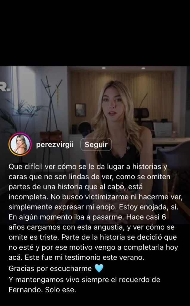 Además, escribió: "Qué difícil ver cómo se le da lugar a historias y caras que no son lindas de ver, como se omiten partes de una historia que al cabo, está incompleta. No busco victimizarme ni hacerme ver, simplemente expresar mi enojo. Estoy enojada, sí. En algún momento iba a pasarme. Hace casi 6 años cargamos con esta angustia, y ver cómo se omite es triste".