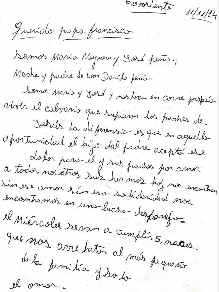 La carta, escrita de puño y letra, es una solicitud al Papa Francisco, que inicia con una presentación de lo ocurrido: “Somos María Noguera y José Peña, madre y padre de Loan Danilo Peña. Somos María y José y nos toca en carne propia vivir el calvario que sufrieron los padres de Jesús, la diferencia es que en aquella oportunidad el Hijo del Padre aceptó ese dolor para Él y sus padres por amor a todos nosotros, sus hermanos; hoy nos encontramos sin ese amor, sin esa solidaridad, nos encontramos en una lucha despareja”.