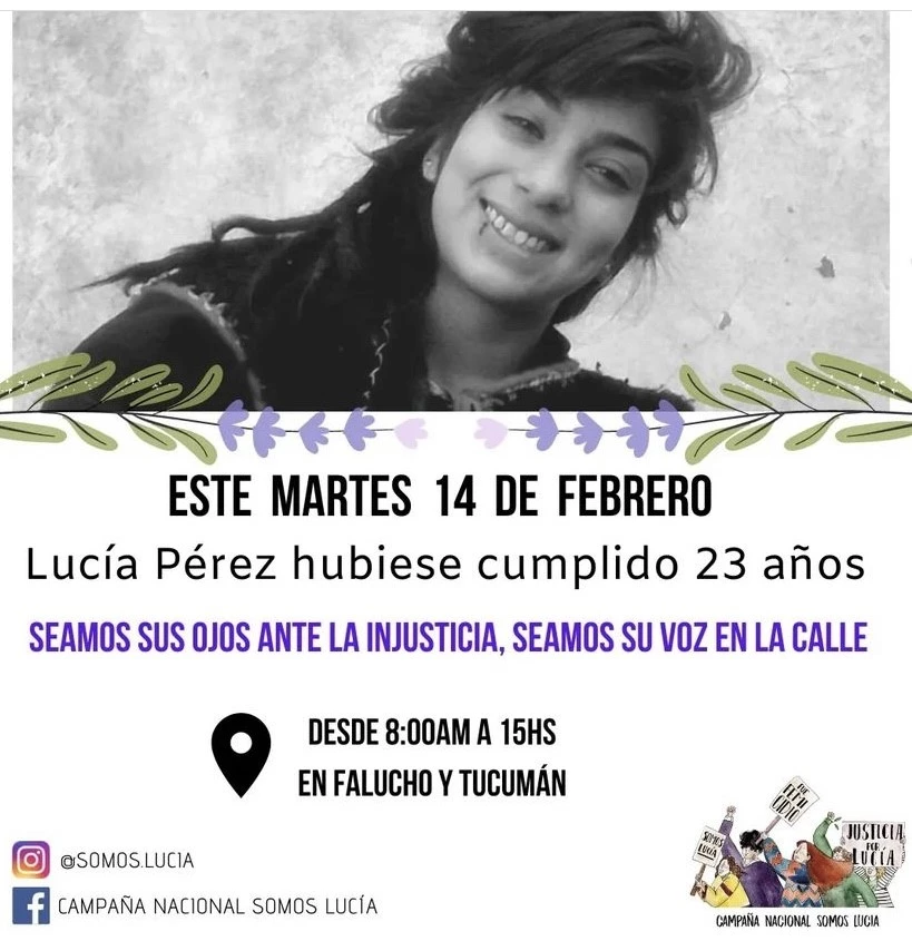 Este martes 14 de febrero Lucía -que soñaba con ser veterinaria y no pudo cumplir sus ideales porque fue brutalmente asesinada cuando tenía 16 años- hubiese cumplido 23. "Seamos sus ojos ante la injusticia, seamos su voz en la calle", es el lema con el que se difundió en redes la movilización. La convocatoria arrancó a las 8 de la mañana y durará a lo largo de toda la jornada.