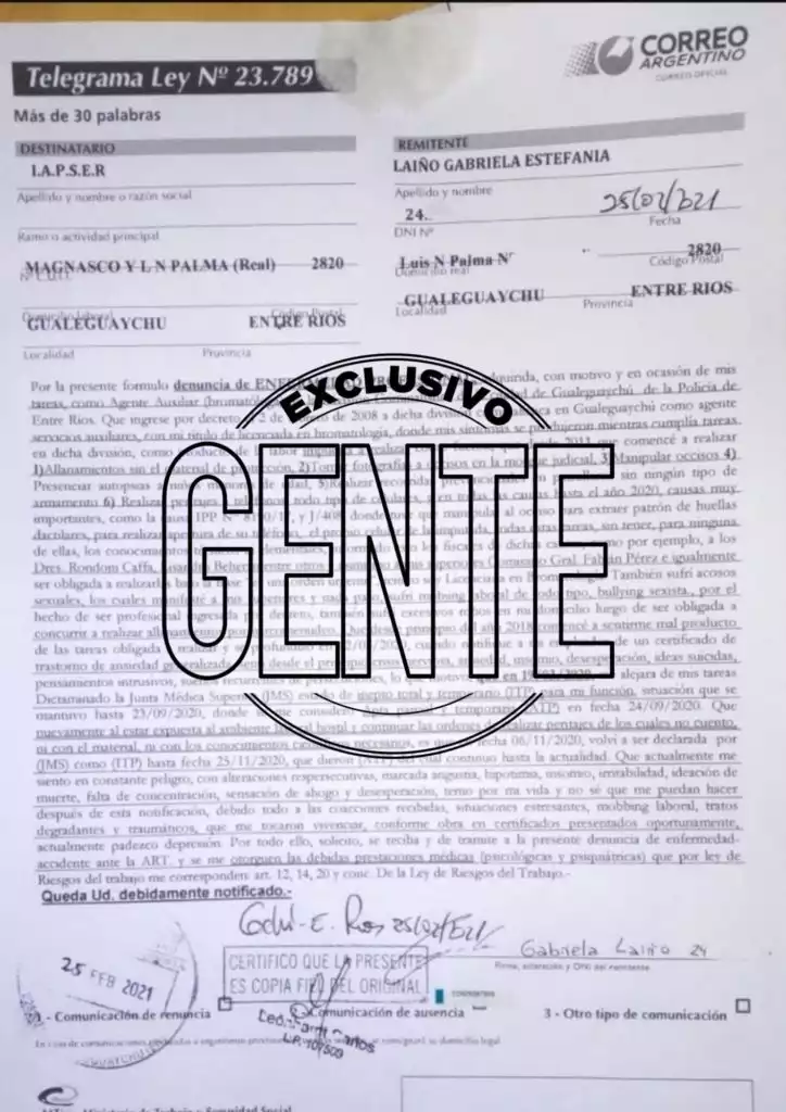 La demanda ingresó el viernes 9 de julio en la Justicia, GENTE tuvo acceso a la causa, donde Laiño también denuncia "acoso sexual, mobbing laboral y bullying sexista, por el hecho de ser una profesional ingresada por decreto". Como así también haber "sufrido reiterados robos en su domicilio luego de realizar allanamientos por narco menudeo."