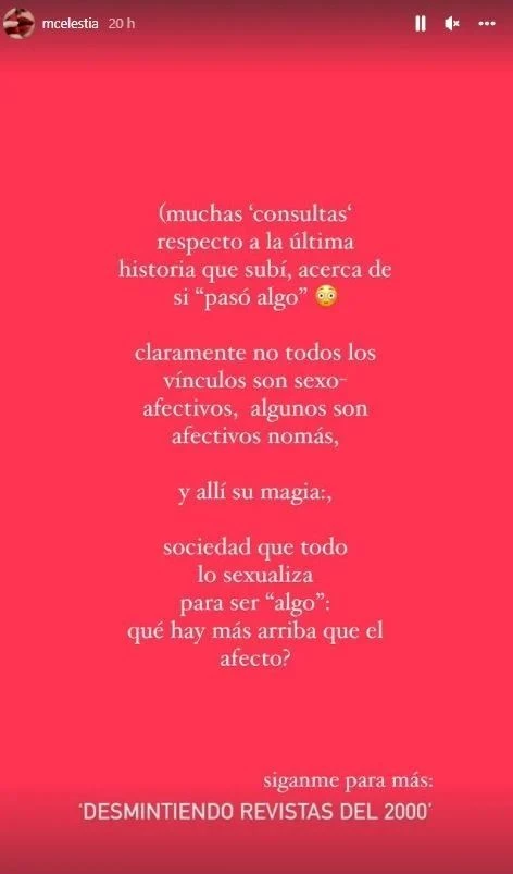 En esa línea, los seguidores de ella comenzaron a consultar si realmente existió ese romance entre ellos. "Muchas consultas sobre si pasó algo... Claramente, no todos los vínculos son sexo-afectivos, algunos son afectivos nomás. Y allí su magia...", expresó.
