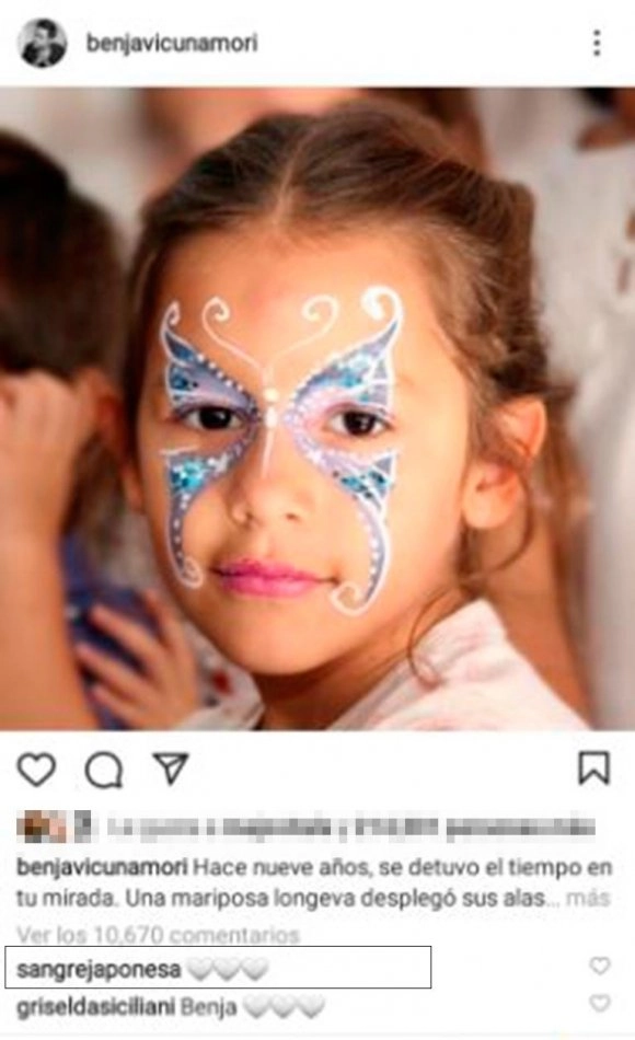 Hoy a nueve años de su partida Vicuña realizó un emotivo posteo en Instagram para recordar a su niña. "Hace nueve años, se detuvo el tiempo en tu mirada. Una mariposa longeva desplegó sus alas y yo intenté leerla como un papiro, sin entender la letra. Desde ese día, te lleno de cartas mi niña, cartas que van al cielo como mariposas borrachas. Te cuento nuestros días e imagino los tuyos", escribió el actor. China Suárez, al ver la dedicatoria comentó la publicación con corazones blancos.