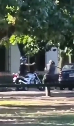 La secuencia escaló cuando Lau descendió del automóvil con un palo en la mano y se dirigió hacia el motociclista. Según se vio en las grabaciones, allí comenzó un forcejeo que incluyó golpes de puño. De acuerdo con la versión de los presentes, el motociclista le habría aplicado al menos dos trompadas.