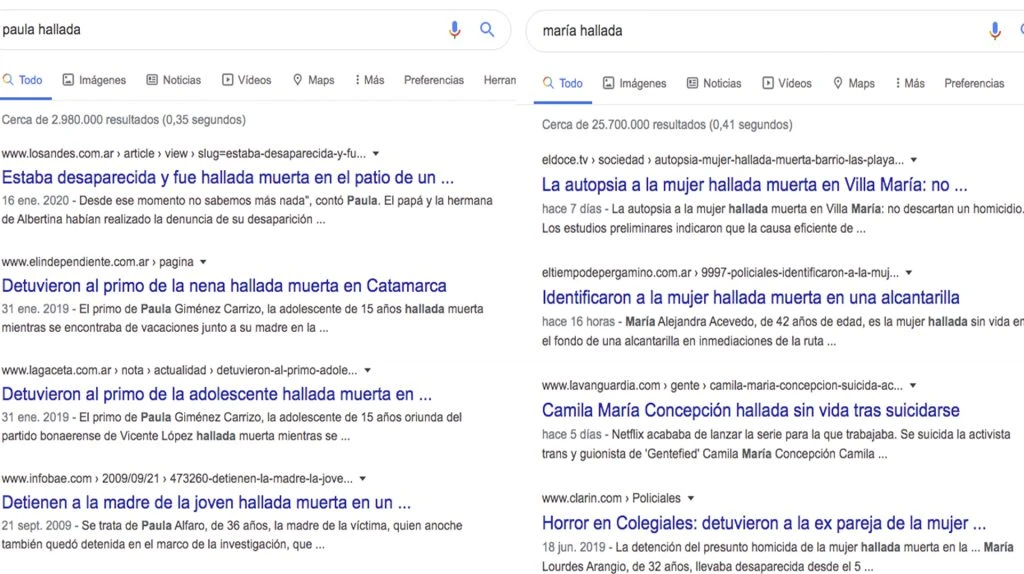 El resultado interpela a cada una personalmente. No importa el nombre que escribas, siempre que el nombre de una mujer vaya acompañado de la palabra "hallada", los primeros resultados que ofrece el buscador están relacionados a femicidios.