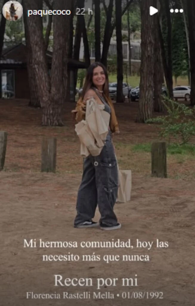 En paralelo, desde la cuenta de su emprendimiento en redes sociales compartieron un mensaje dirigido a su comunidad de más de 90 mil seguidores: “Mi hermosa comunidad, hoy las necesito más que nunca. Recen por mí. Florencia Rastelli Mella - 01/08/1992″, publicaron en una historia