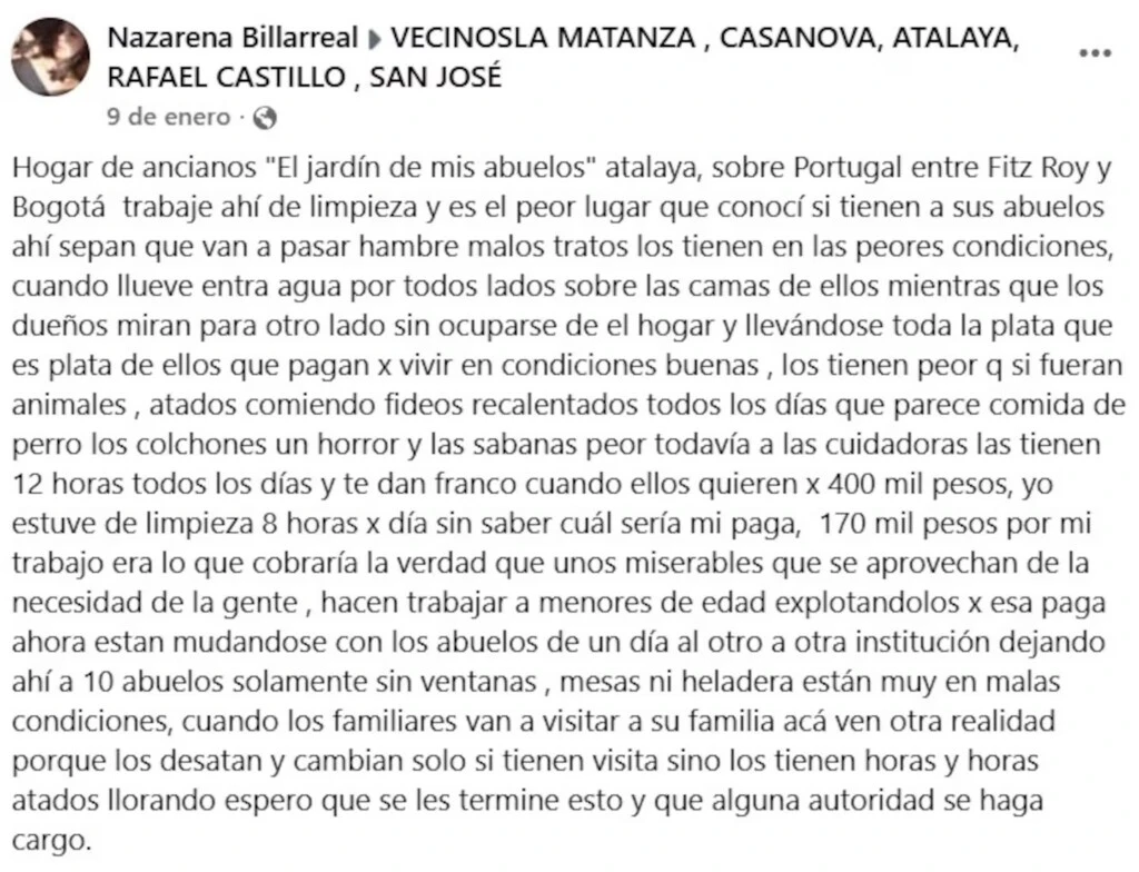 Luego del allanamiento, una extrabajadora del lugar difundió un mensaje en redes denunciando “hambre, malos tratos y filtraciones de agua sobre las camas cuando llueve”. Afirmó que, durante las visitas familiares, desataban a los residentes para ocultar la rutina de sujeciones. Estos aportes ya fueron remitidos a la fiscalía para su valoración.
