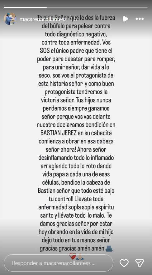 En su posteo escribió: “Te pido Señor que le des la fuerza del búfalo para pelear contra todo diagnóstico negativo, contra toda enfermedad. Vos SOS el único padre que tiene el poder para desatar para romper, para unir señor, dar vida a lo seco. Sos vos el protagonista de esta historia señor y como buen protagonista tendremos la victoria señor. Tus hijos nunca perdemos, siempre ganamos señor porque vos vas delante nuestro declaramos bendición en BASTIAN JEREZ en su cabecita comienza a obrar en esa cabeza señor ahora!”.