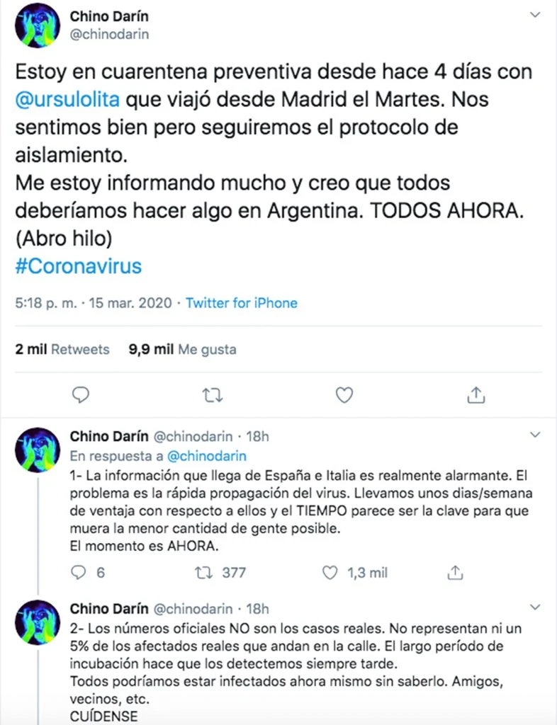 Y es responsabilidad de todos y todas tomar los recaudos para evitar la propagación del Covid-19, tal como lo expuso el Chino Darín, quien desde sus redes explicó que comenzó una cuarentena preventiva junto a Úrsula Corberó, su novia, que llegó desde a la Argentina desde España -uno de los países más afectados- el pasado 10 de marzo.