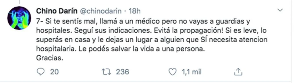 “Que no cunda el pánico. No haga nada que no sea fundamental. No vayan al médico por cualquier pelotudez. Dejemos lugar a los pacientes graves, son los menos pero sus vidas dependen de la asistencia médica. ¡Seamos solidarios y cuidemos a los mayores!”, escribió expresando solidaridad.