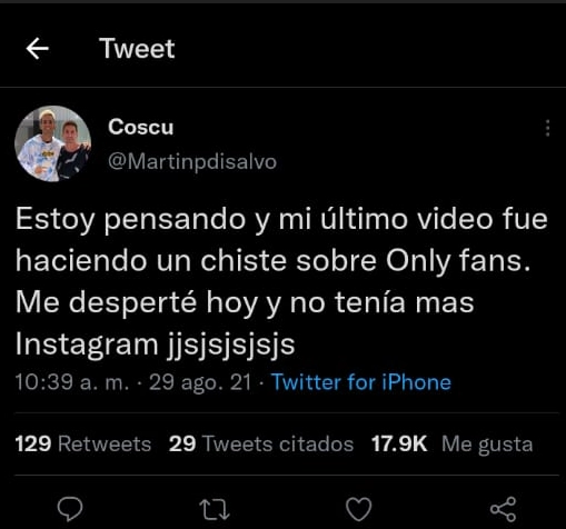 A primeras horas del domingo cientos de fanáticos de Martín Disalvo, más conocido como “Coscu”, comenzaron a escribirle por sus redes sociales ya que se encontraban imposibilitados de ver su perfil de Instagram. Algunos creían que el joven los había bloqueado ya que solo podían ver su foto de perfil, pero no sus seguidores ni contenido.