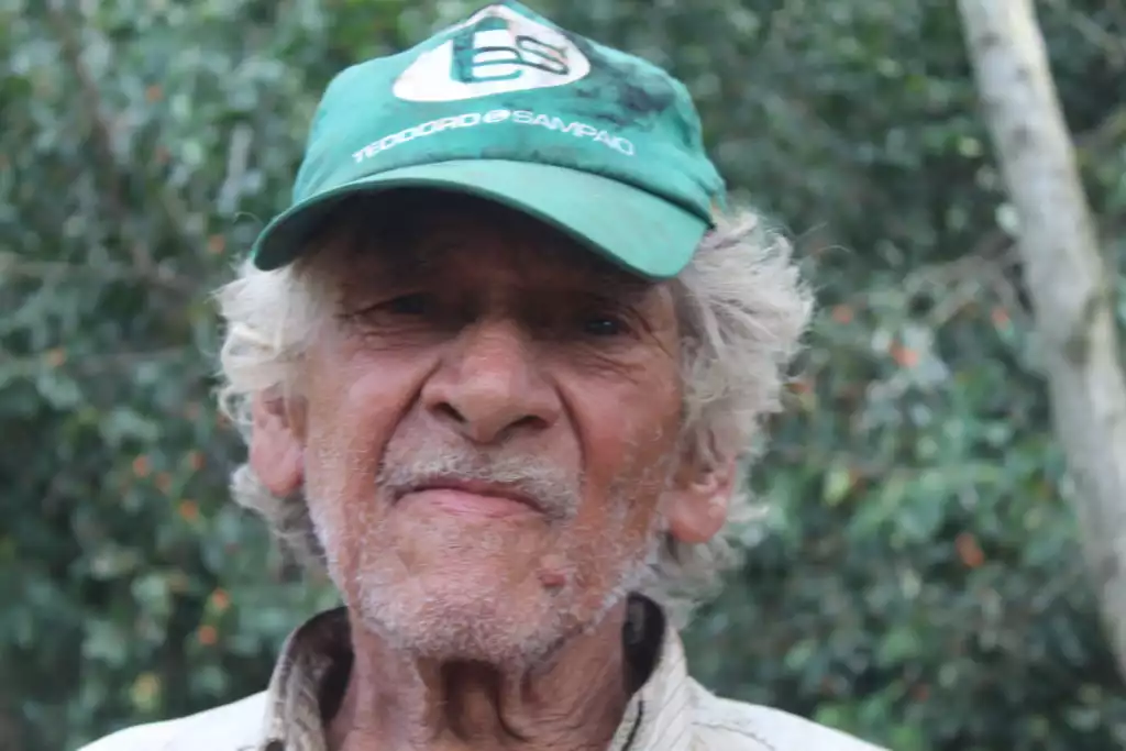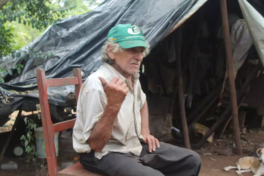 Antonio no recuerda hace cuánto tiempo vive en las tierras por donde pasará una sembradora de criptomonedas. Cuenta que tenía siete años cuando trabajaba en la zona llevando agua a los que hacían el camino o se dedicaban a la tala de árboles. Hoy, con 86 recién cumplidos, nos alcanza con amabilidad una silla de plástico, un balde y un cajón de cerveza para que nos sentemos. Sus manos son fuertes y llevan los surcos como huellas del tiempo y de una vida dura.