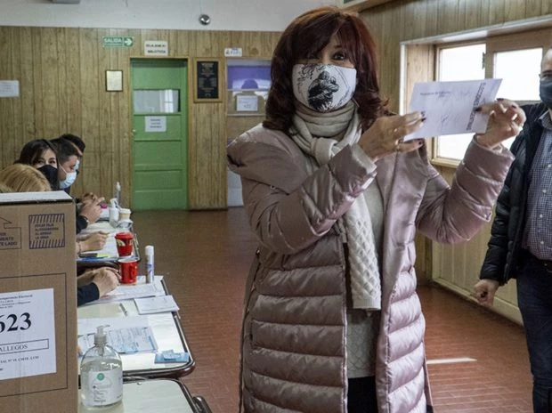 La vicepresidenta de la Nación, Cristina Fernández de Kirchner, votó en Río Gallegos pasadas las 12.30 del mediodía. Cumpliendo con los protocolos sanitarios por la pandemia se presentó con su propia lapicera y pegó el sobre con pegamento.