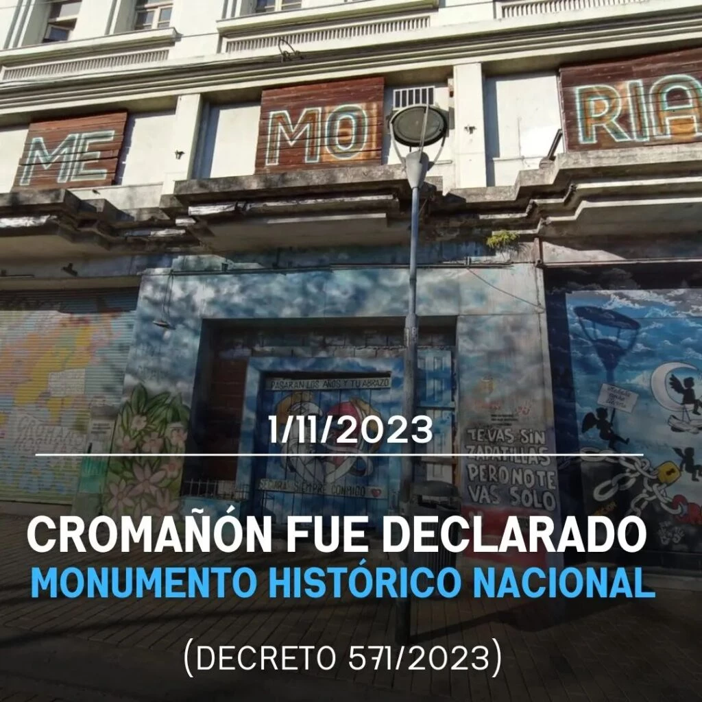 Este miércoles 1º de noviembre el boliche República de Cromañón fue declarado Monumento Histórico Nacional. La medida fue oficializada mediante el Decreto 571/2023 y fue publicada en el Boletín Oficial.