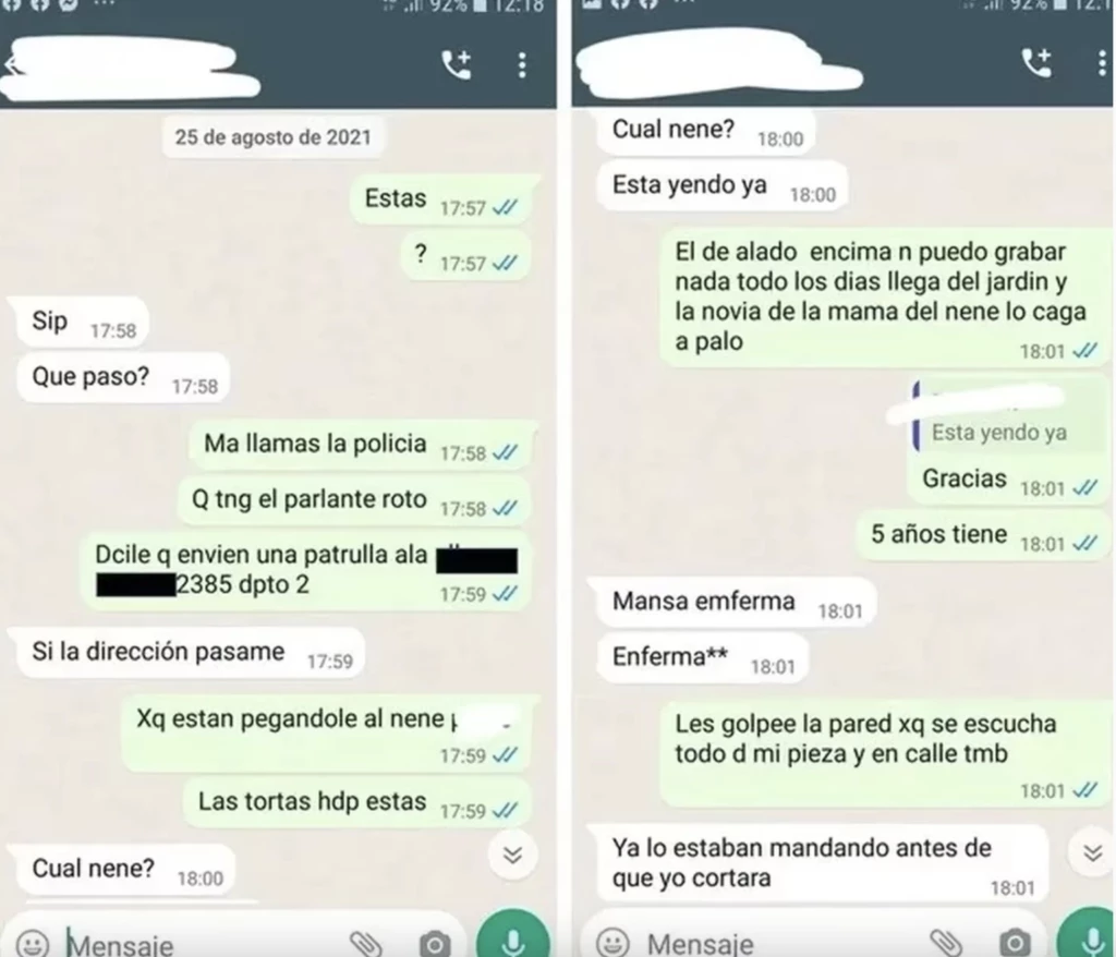 “¿Me llamás a la policía? Que yo tengo el parlante roto. Porque le están pegando al nene del lado”, escribió la vecina en un intento de ayudar al nene. Del otro lado, su hermano le respondió que la policía ya estaba en camino.