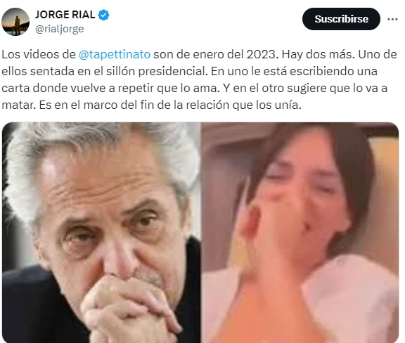 En esta misma publicación, el periodista detalló: "Hay dos más. Uno de ellos sentada en el sillón presidencial. En uno le está escribiendo una carta donde vuelve a repetir que lo ama (que ya salió a la luz). Y en el otro sugiere que lo va a matar. Es en el marco del fin de la relación que los unía".