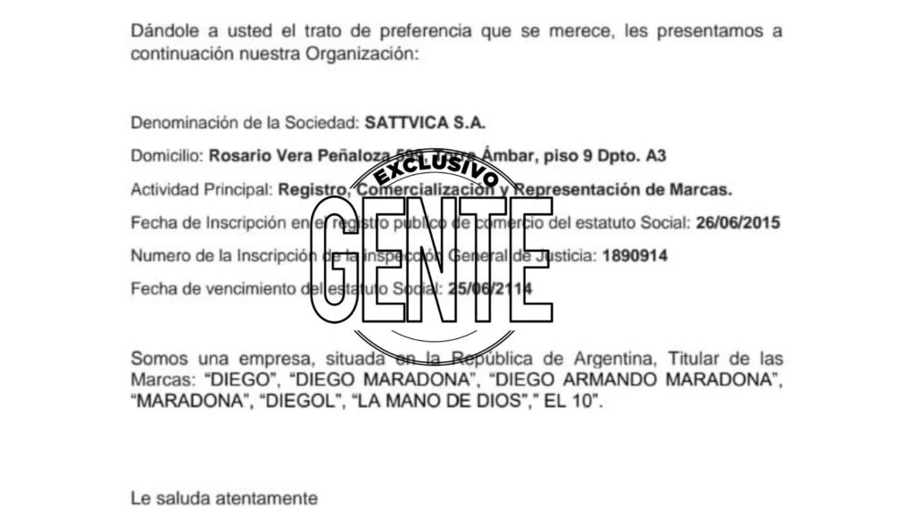 GENTE tuvo acceso al listado de una veintena de países en cuatro continentes -excepto África- donde está registrada la marca Maradona, así como la carta de presentación comercial.