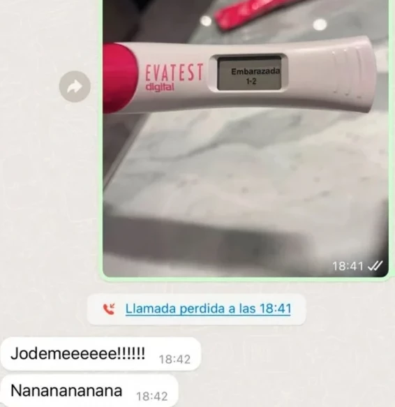La mujer mostró que su pareja se enteró que serían padres por medio de WhatsApp. En la imagen se puede ver una prueba de embarazo que da positivo. Luego una llamada perdida de ella hacia él y la respuesta del letrado sorprendido: "¡Jodemeeeeeeeee! Nananananan".