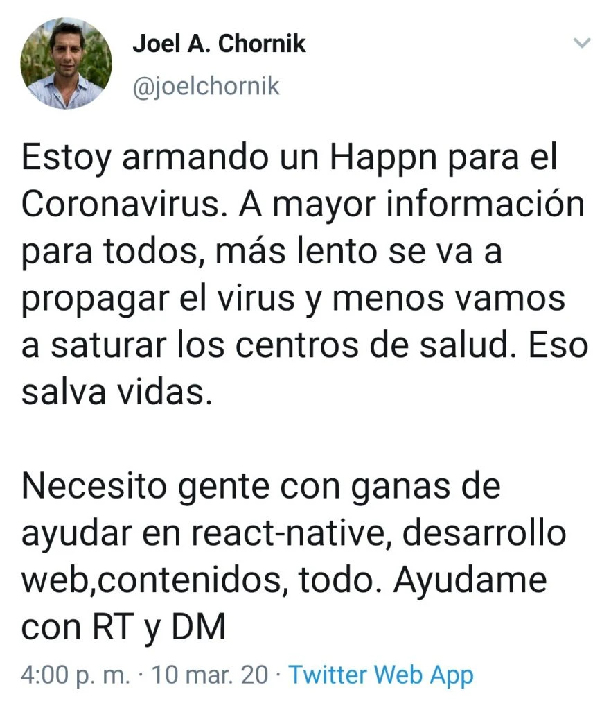 El 10 de marzo lanzó una convocatoria a través de sus redes para crear una herramienta capaz de agilizar el funcionamiento urbano durante el brote de COVID-19. “Estoy armando un Happn para el Coronavirus”, decía el anunció que derivó en CoTrack, una aplicación de código abierto realizada en forma colaborativa para hackear al virus.