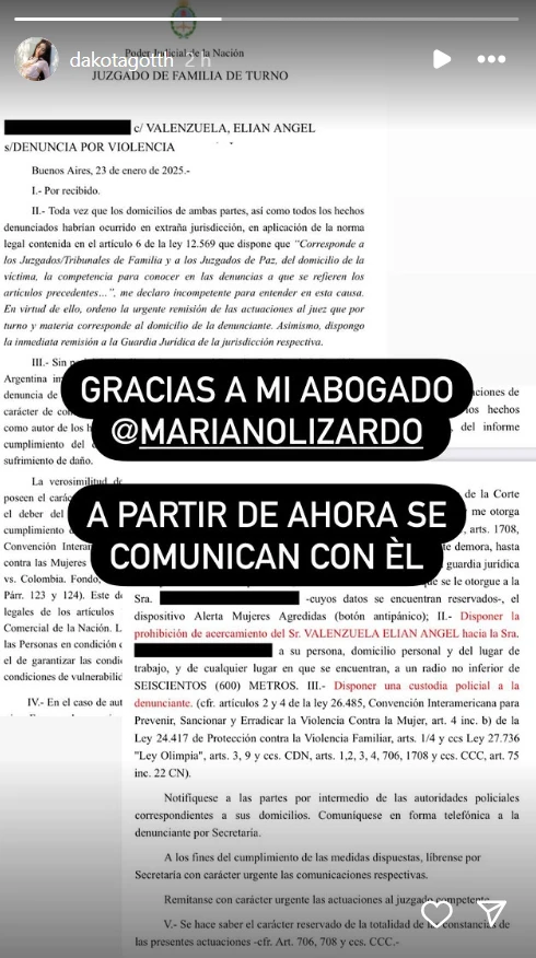 Este viernes, Dakota Gotth, la ex novia de L-Gante, compartió en sus redes sociales una copia de la denuncia que presentó a través de su abogado, el doctor Mariano Lizardo, contra el músico por violencia. El documento fue presentado este jueves 23 de enero en el Juzgado de Familia de Turno, según se puede leer en el posteo que publicó la joven modelo.