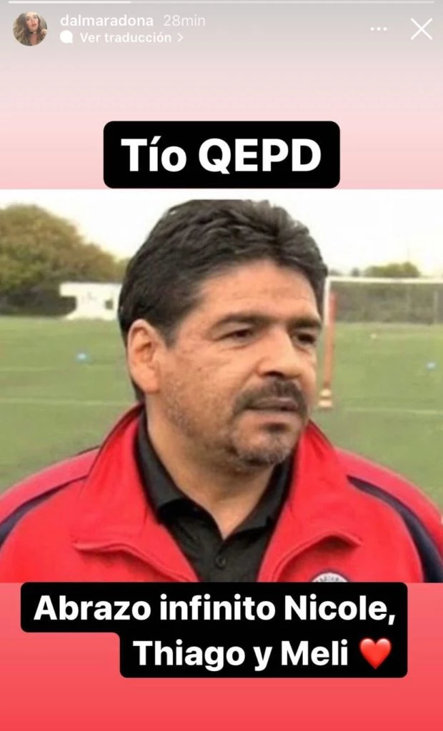 Dalma decidió subir una foto de su tío con la sigla de "Que en paz descanses" y le envió fuerzas infinitas a sus tres primos: "Abrazo Infinito Nicole, Thiago y Meli".