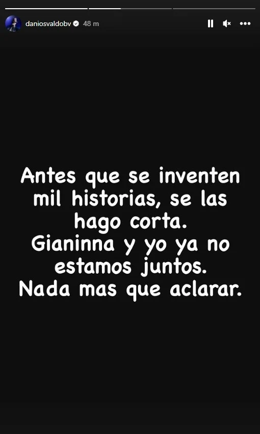 “Antes que inventen mil historias, se las hago corta. Gianinna y yo ya no estamos juntos. Nada más que aclarar”, fue el mensaje que lanzó el cantante en sus historias de Instagram, sin ningún tipo de filtro.