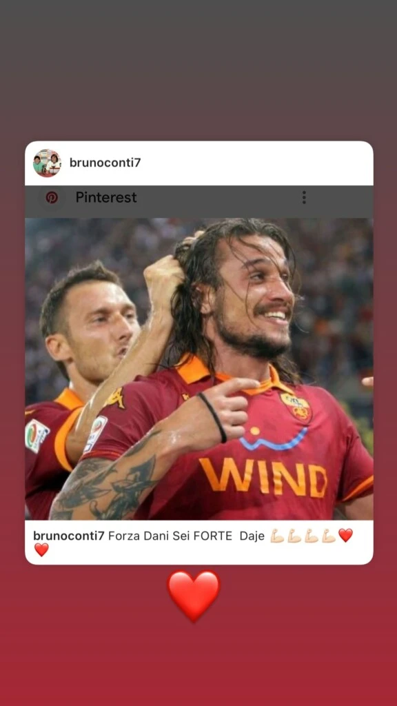 Por ejemplo, Bruno Conti, el actual entrenador de la Selección Italiana de Fútbol, subió un posteo con una foto de Daniele De Rossi y Daniel Osvaldo. "Vamos Dani tu eres FUERTE vamos", escribió junto a una serie de emojis. Por su parte, el exnovio de Jimena Barón subió la publicación con un corazón rojo.