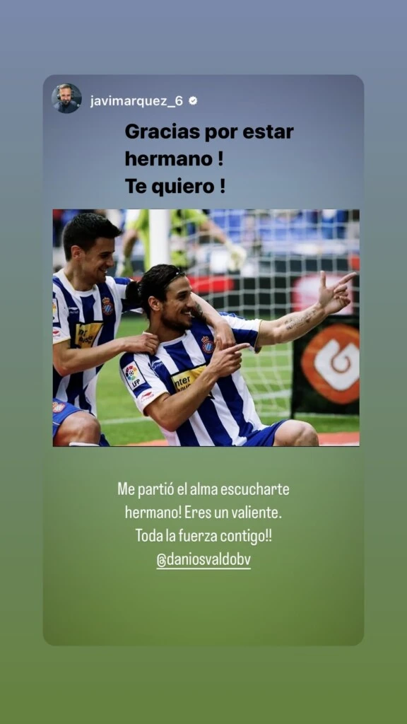 Un excompañero que le dejó un mensaje fue Javi Márquez. Juntos, disputaron partidos de Liga Española y se ganaron el corazón de la hinchada del Español, club de Barcelona. "¡Me partió el alma escucharte hermano! Eres un valiente. ¡¡Toda la fuerza contigo!!", le escribió Márquez en una storie. Osvaldo la reposteó y escribió: "¡Gracias por estar hermano! ¡Te quiero!".