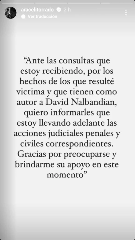 Agradecida por la repercusión que tuvo su caso, Araceli decidió compartir un comunicado en su cuenta de Instagram oficial. “Ante las consultas que estoy recibiendo, por los hechos de los que resulté víctima y que tienen como autor a David Nalbandian, quiero informarles que estoy llevando adelante las acciones judiciales penales y civiles correspondientes”, informó la joven a sus más de 200 mil seguidores. “Gracias por preocuparse y brindarme su apoyo en este momento”, concluyó.