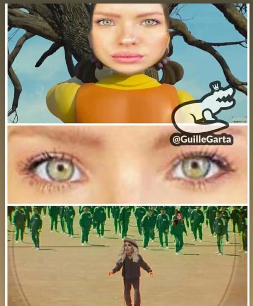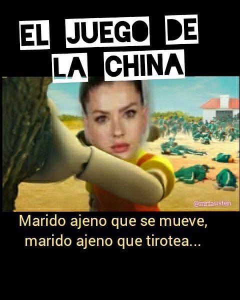 Otro de los memes referidos a la serie que narra la historia de 456 ciudadanos tapados de deudas que ponen en riesgo su vida para ganar el botín final de 45,600 millones de wones coreanos es el siguiente, en el que hacen un paralelismo de Suárez con otras personalidades "chinas" populares, como la famosa dueña del supermercado, célebre por su frase "por qué?, no hay porqué", y la protagonista animada de El juego del calamar que funciona como detector de movimiento.