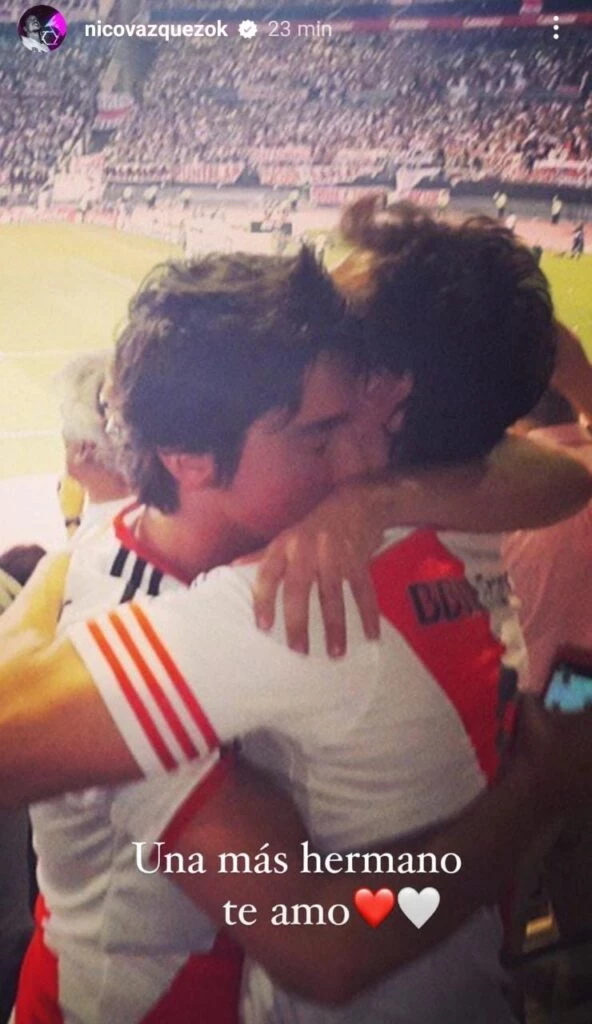 Nicolás Vázquez (46), fanático de River, festejó este triunfo de una manera súper emotiva. El actor compartió una foto vintage junto con su hermano Santiago que murió en el año 2016. En la tierna postal se ven a ambos abrazándose en el estadio Monumental.