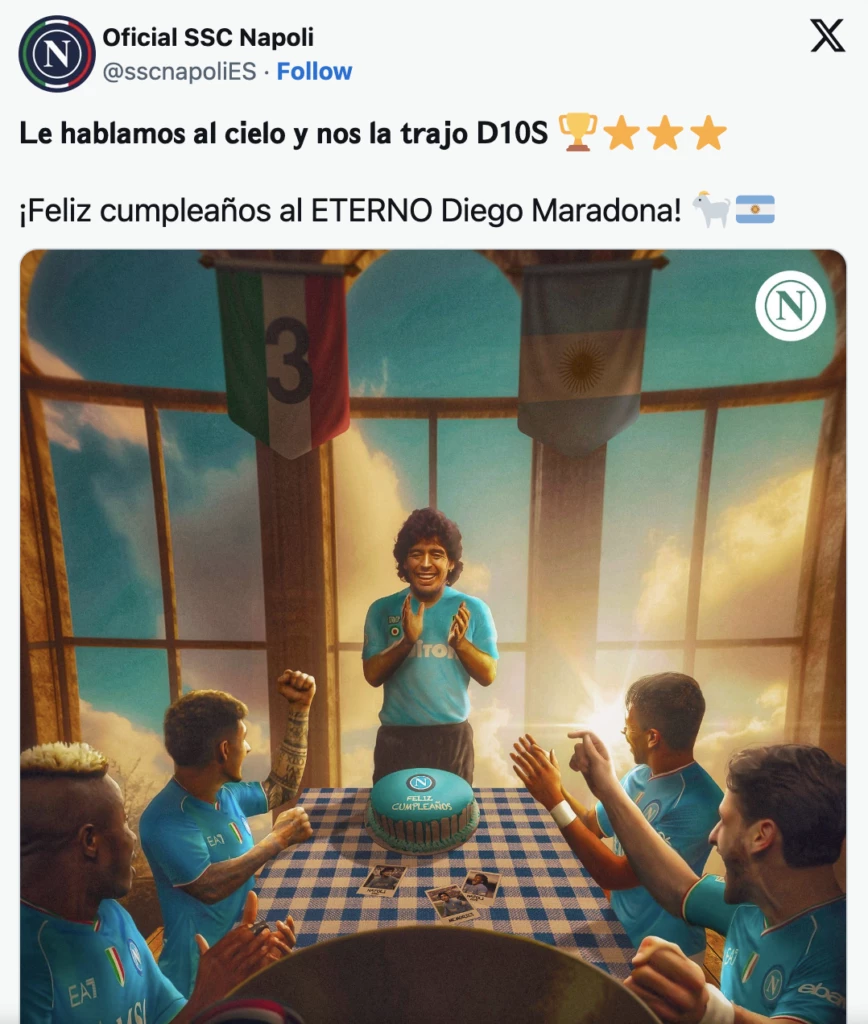 "Le hablamos al cielo y nos la trajo D10S. ¡Feliz cumpleaños al ETERNO Diego Maradona!", festejó el SSC Napoli en sus redes por el que sería el cumpleaños 63 de Diego Armando Maradona.