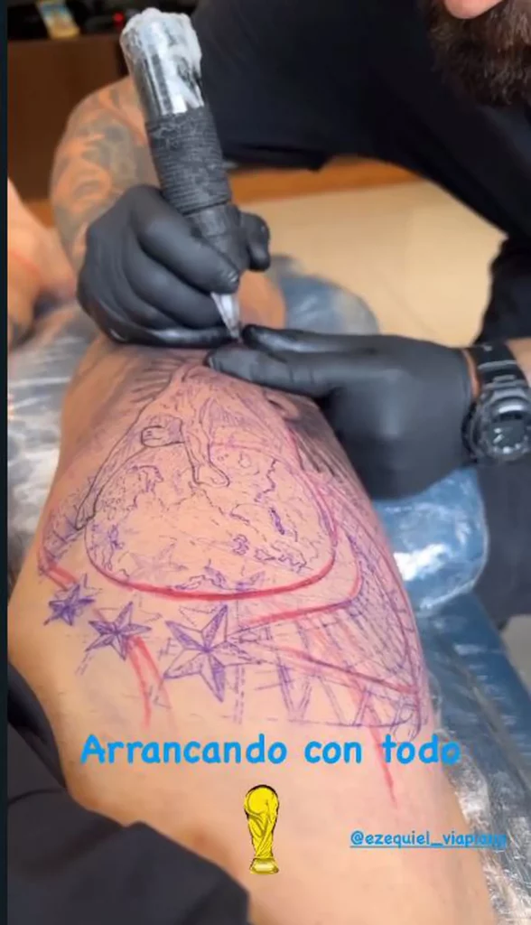 El futbolista que está en Rosario desde el martes, decidió tatuarse la Copa del Mundo en su pierna derecha. Un tatuaje bastante grande, que está a la altura del logro, un sueño que siguió a pesar de las pálidas y los impedimentos a la hora de estar en la Selección y que finalmente este domingo se le terminó dando junto a sus compañeros.
