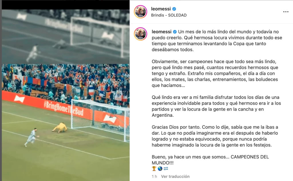 Este 18 de enero se cumple un mes del histórico tercer triunfo de Argentina. Es por eso que Lionel Messi decidió tomarse un tiempo para reflexionar sobre su victoria tan esperada: “Un mes de lo más lindo del mundo y todavía no puedo creerlo. Qué hermosa locura vivimos durante todo ese tiempo que terminamos levantando la Copa que tanto deseábamos todos”.