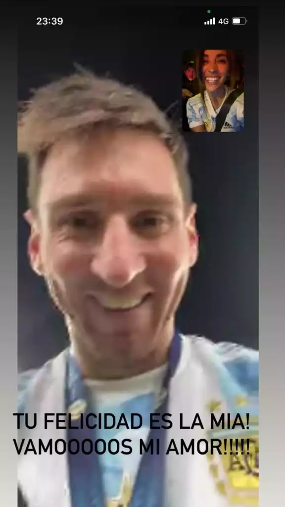 Con la medalla de campeón sobre el pecho y la camiseta alusiva a la conquista de la Copa América, Leo tomó su celular en medio de los festejos en el campo de juego y se contactó primero con Antonela, quien estaba acompañada de sus tres hijos.