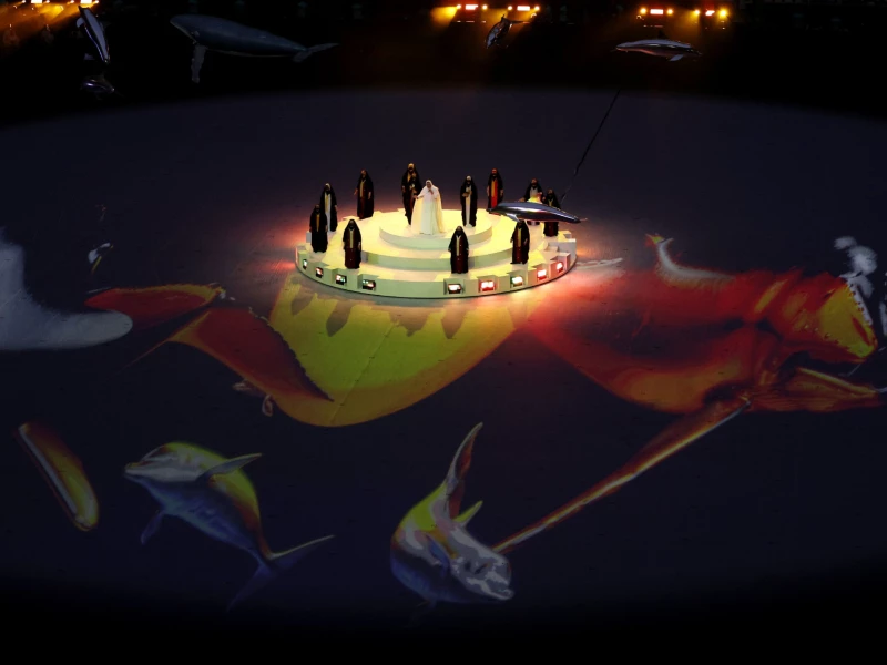 La fiesta empezó con todo en el Estadio de Lusail, con capacidad para 90 mil personas: varios delfines y una ballena volando rodeaban a la cantante y la presentación en vivo de una cantante que entonó "What a wonderful world", con el fin de resaltar la belleza de la naturaleza a su alrededor.