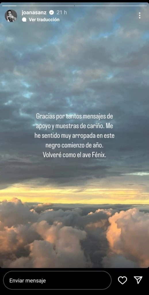 En la segunda historia que decidió subir, la modelo agradeció a todos los comentarios que dejaron sus seguidores, más teniendo en cuenta que Joana perdió a su madre hace unos días atrás. "Gracias por tantos mensajes de apoyo y muestras de cariño. Me he sentido muy arropada en este negro comienzo de año. Volveré como el ave Fénix", comentó Sanz.