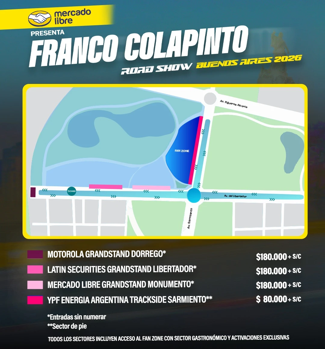 Las tribunas principales —Motorola Grandstand Dorrego, Latin Securities Grandstand Libertador y Mercado Libre Grandstand Monumento— tendrán un valor de $180.000 más service charge. Estos espacios estarán ubicados en puntos estratégicos del circuito, garantizando vistas destacadas del paso del auto.