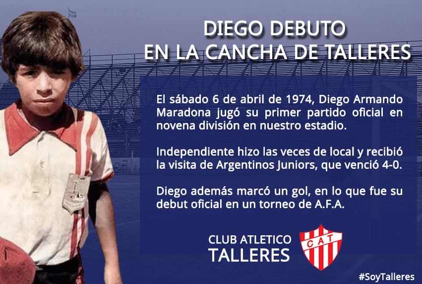 Diego Armando Maradona jugó su primer partido oficial de inferiores el 6 de abril de 1974 en la cancha de Talleres de Remedios de Escalada. En aquella oportunidad, la novena división de Argentinos Juniors se midió contra Independiente, equipo que, al no tener disponible su cancha, alquiló una en la localidad vecina.