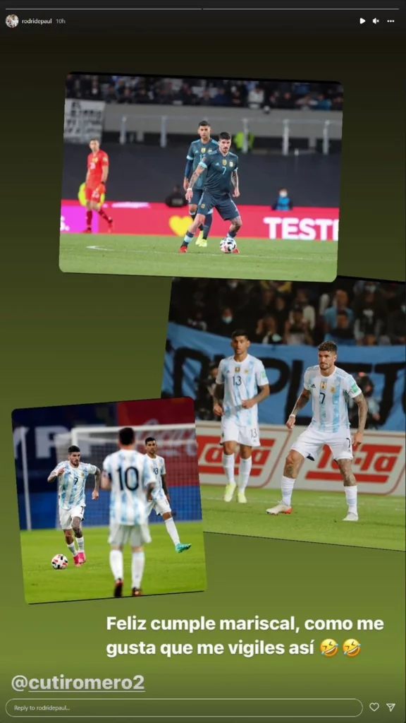 Sin embargo, en las últimas horas decidió saludar a su compañero de equipo en la Selección Argentina, Cristian Romero, quien se encuentra cumpliendo 24 años de edad. Con un collage de fotos jugando en la cancha, De Paul dijo, “Feliz cumple Mariscal, cómo me gusta que me vigiles así”.